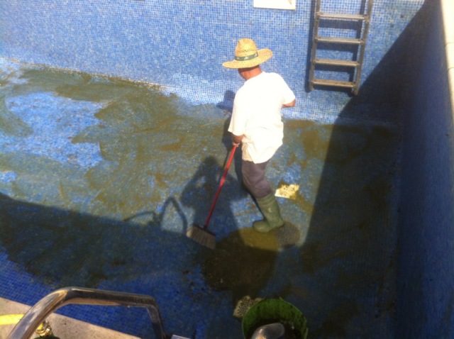 Una vez comprobemos que todo esta correcto, vaciamos el vaso y limpiamos todo el grueso de residuo orgánico que haya quedado del invierno. Después desinfectamos el vaso con ácidos especiales y maquinaria especial, pintamos en caso de necesidad y si es de gresite o poliéster darle un tratamiento de dureza para la cal del agua.