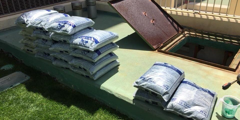 Puesta en marcha de Piscina Comunitaria en Zaragoza. Hemos sustituido la actual arena de sílice por Vidrio machacado de varias granulometrías para su mejor filtración y durabilidad de elemento filtrante.