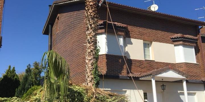 Tala de palmeras washingtonia robusta o Palmera Mexicana,que por su inadecuado lugar de plantación acaba generando problemas varios
